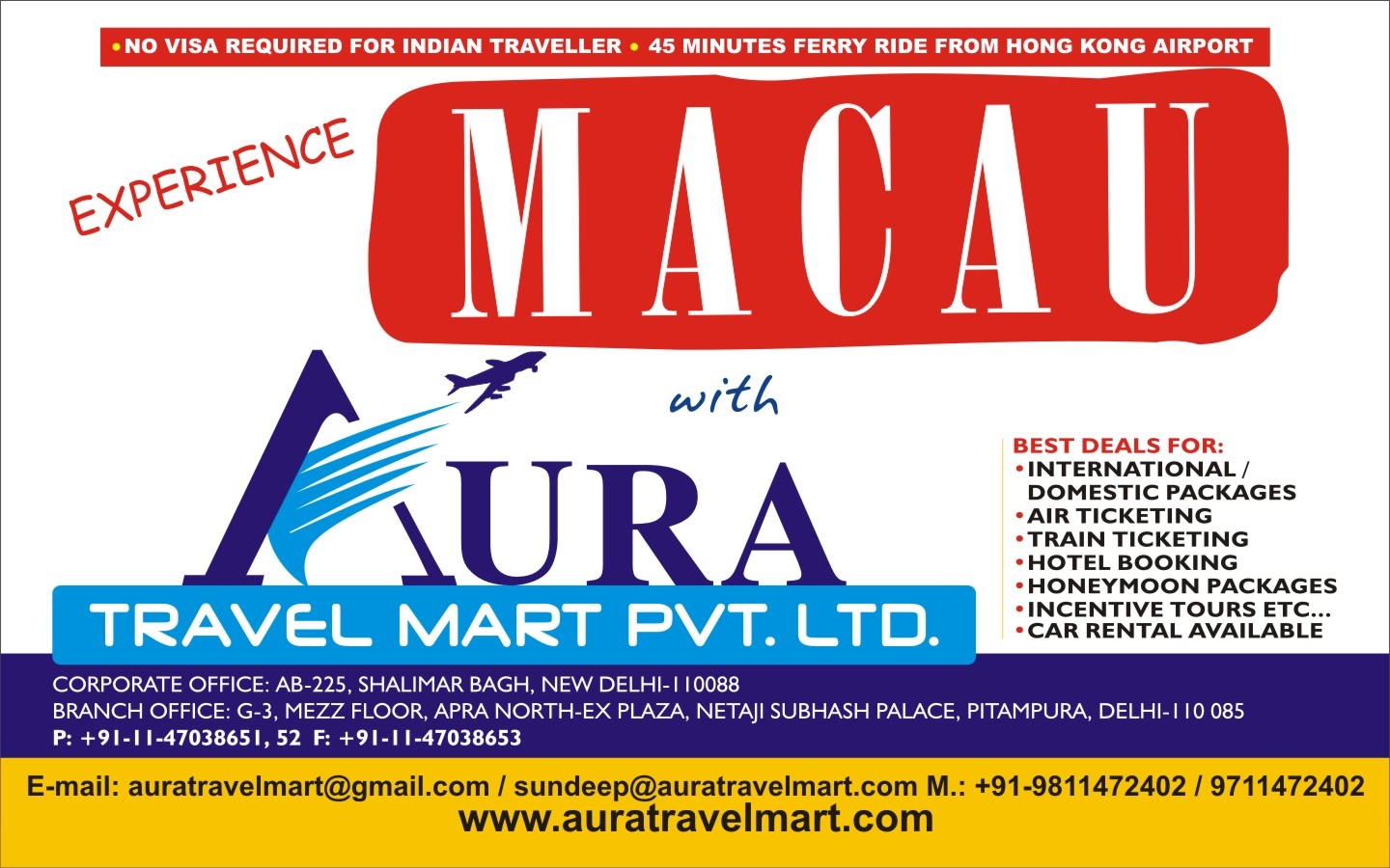 Aura Travel Mart Private Limited. has been recognized to be one of the Market Leaders as a full service Travel Agency that specializes in Air Travels & Package Tours (Both Domestic & International, Outbound & Inbound) and provides recreational and business travelers with professional services & consultation.